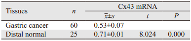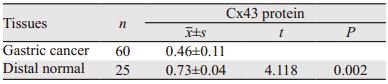 | 图 4 Cx43蛋白在正常和胃癌组织中的表达 Figure 4 Expression levels of Cx43 protein in gastric cancer and normal gastric cancer tissues |