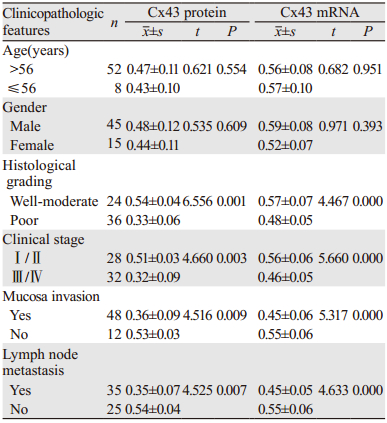 Cx43表达减少或缺失与多种肿瘤的发生发展密切相关[8, 9, 10, 11, 12, 13]。Cx43对肿瘤生长的抑制被认为是通过间隙连接散发一些生长抑制因子,如通过环腺苷酸参与GJ依赖的生长抑制,GJIC功能减低或缺失,来自正常细胞的调控信号则不能到达恶变细胞,使其无限制地生长导致肿瘤的发生[10, 11]。正常细胞癌变过程中,缝隙连接蛋白表达降低,GJIC功能障碍,使细胞间失去接触抑制功能,肿瘤细胞异常生长,促进恶性演进,因此Cx43在肿瘤恶性演进过程中也发挥着重要作用。本研究结果亦证实Cx43在正常胃黏膜组织中的蛋白量较在癌组织中高,从而间接证实了细胞癌变过程中存在间隙连接通讯功能障碍。Tang等[14]研究发现在胃肿瘤细胞中与邻近的正常细胞相比Cx43显著性的低表达,在有转移的淋巴结中与胃肿瘤细胞相比Cx43显著高表达,同时提出Cx43的低表达可能促成了胃癌的发生。本研究证实了Cx43在胃癌组织中的蛋白量比正常胃黏膜组织中低,Cx43在有淋巴结转移的胃癌中的表达比在无淋巴结转移者要低,高中分化胃癌Cx43的表达均高于低分化胃癌组,Ⅰ+Ⅱ期胃癌患者Cx43的表达高于Ⅲ+Ⅳ期者。所以我们推测Cx43可能与多种致瘤因素共同参与了胃癌的发生,并影响了胃癌的生物学行为。Cx43表达水平下降和间隙连接细胞间通讯功能异常可能参与了胃癌的恶性程度的进展和肿瘤细胞的侵袭转移。