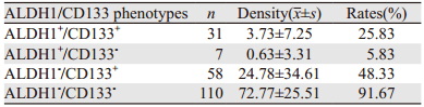 1.2.3 阳性结果判断ALDH1阳性细胞为细胞质蓝黑色,CD133阳性细胞为细胞膜红色,部分细胞质也呈阳性表达,根据ALDH1及CD133着色情况,将细胞分为以下四种表型:(1) ALDH1+/CD133+表型细胞表现为细胞质蓝黑色、细胞膜红色;(2) ALDH1+/CD133-表型为细胞质蓝黑色、细胞膜不着色;(3) ALDH1-/CD133+表型为细胞质不着色或红色、细胞膜红色;(4) ALDH1-/CD133-表型为细胞质及细胞膜均不着色。选取一张切片中的3个代表性视野,计数高倍视野(× 400)下的上述表型细胞数,取其平均值为本例的细胞密度。某一表型在所有组织中细胞密度的均值表示为:均数±标准差。