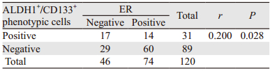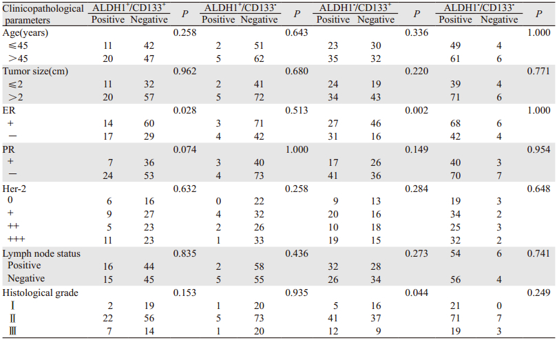 乳腺癌ALDH1+/CD133+、ALDH1-/CD133+两种表型细胞与ER表达有关(P<0.05),ALDH1-/CD133+表型细胞与肿瘤的分级有关(P<0.05),见表 2。对ALDH1+/CD133+表型细胞与ER的表达情况进行相关性分析,结果显示ALDH1+/CD133+表型细胞与ER阴性表达呈正相关(r=0.200),见表 3。