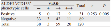 在120例乳腺浸润性导管癌组织中VEGF阳性表达82例,阴性表达38例,阳性表达率为68.33%(82/120)。对120例乳腺癌患者ALDH1+/CD133+表型细胞与VEGF表达的结果进行Spearman等级相关分析,结果显示ALDH1 +/CD133 +表型细胞与VEGF的表达呈高度正相关(r=0.253,P=0.005),见表 4。