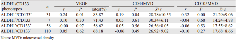 1.3 统计学方法采用SPSS17.0软件对实验结果进行统计学分析。ALDH1/CD133与临床病理指标的关系采用χ2检验;与血管生成指标之间的关系采用Pearson相关分析。计量资料以(x±s)表示,以α=0.05作为检验水准。