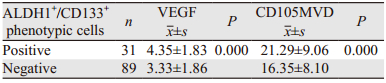 根据患者组织中有无ALDH1+/CD133+表型细胞,将120例乳腺浸润性导管癌组织分为两组,分别计算VEGF、CD105 MVD表达量的均值,计算结果显示两组VEGF表达量的差异具有统计学意义(P <0.05);两组CD105 MVD均值之间差异有统计学意义(P<0.05)。且结果显示存在ALDH1+/CD133+表型细胞的组织中VEGF和CD105 MVD的表达量明显高于不存在此表型细胞的组织,见图 3、见表 6。