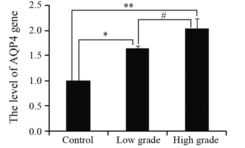 2.2 荧光定量PCR检测AQP4基因的表达结果AQP4基因扩增倍数2-ΔΔCT分别为:低级别组(1.65±0.052),高级别组(2.04±0.196),经比较可知AQP4基因相对表达量在实验组高于对照组,两实验组相比,高级别组显著高于低级别组,见图 1。