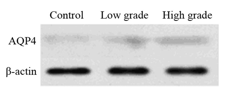 | 图 2 不同级别星形胶质瘤细胞中AQP4蛋白表达 Figure 2 The level of AQP4 protein in different groups of astrocytoma |