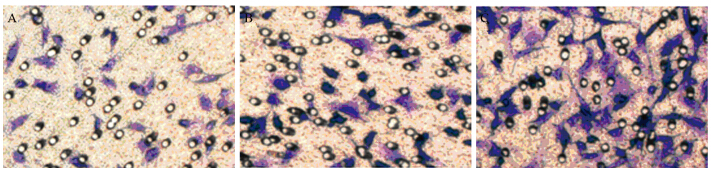 | A: control group; B: low grade group; C: high grade group 图 3 Transwell法检测细胞迁移能力 Figure 3 The migration of normal astrocyte,low-grade astrocytoma cells and high-grade astrocytoma cells measured with Transwell assay |