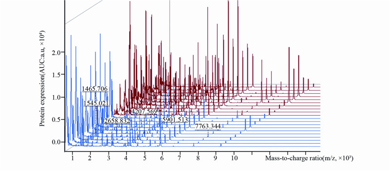 | AUC: Areas under the receiver operating characteristic curve; Red: 10 colorectal cancer patients; Blue: 10 healthy volunteers 图 1 结直肠癌与健康志愿者血清代表性质谱图 Figure 1 Aligned mass spectra of serum protein profile of model construction group obtained by MALDI-TOF after purification with WCX magnetic beads |