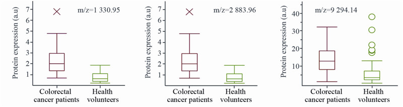 | 图 2 结直肠癌诊断模板中质荷比(m/z)为1 330.95、 2 883.96及9 294.14的蛋白定量结果 Figure 2 Box-and-whiskers plot calculated from the areas of the three proteins (m/z 1 330.95,2 883.96 and 9 294.14) selected for diagnostic model |