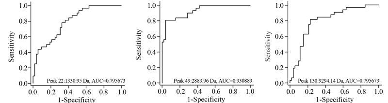 | 图 3 结直肠癌诊断模板中质荷比(m/z)为1 330.95、 2 883.96及9 294.14的蛋白诊断价值评估 Figure 3 Receiver operating characteristic curves(ROC) of the three proteins (m/z 1330.95,2 883.96 and 9 294.14) selected for diagnostic model |