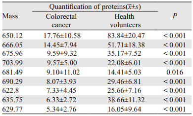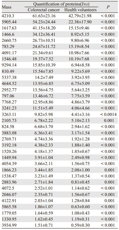 2 结果 2.1 差异蛋白质定量分析建立建模组样本血清蛋白质谱,在相对分子质量600~18 000内共检测到131个蛋白峰,代表性蛋白质谱,见图 1。以峰的曲线下面积评估蛋白的丰度,比较分析结直肠腺癌与健康志愿者之间差异蛋白质谱,共发现44个蛋白峰差异有统计学意义(P<0.05)。其中在结直肠腺癌中表达上调峰35个,表达下调峰9个,见表 1~2。以m/z 1 330.95、2 883.96及9 294.14等3个差异蛋白峰为例,其定量结果显示在结直肠腺癌中均明显升高,见图 2。