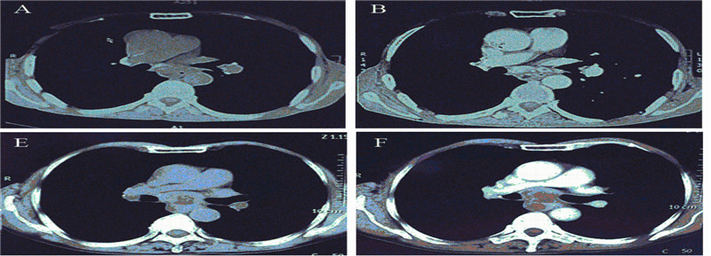 | A:plain scan,CT value:45.56Hu;B:enhanced scan,CT value:100.68Hu;A-B:CT showed obvious subcarinal lymph node enlargement,the ratioof length-short diameter was more than 2:1,considered as transfer,confirmed as transfer pathologically;C:plain scan,CT value:41.04Hu;D:enhanced scan,CT value:49.88Hu;C-D:CT showed no obvious subcarinal lymph node enlargement,the ratio of length-short diameter was more than2:1,considered as transfer,confirmed as no transfer pathologically;E:plain scan,CT value:45.40Hu;F:enhanced scan,CT value:76.88Hu;E-F:subcarinal lymph node ring-enhancement and central necrosis,the size was 3.7cm×3.5cm,confirmed as transfer pathologically;G:plain scan,CTvalue:38.55Hu;H:enhanced?scan,CT value:75.35Hu;G-H:CT showed moderate subcarinal lymph node enlargement,the size was 2.7cm×1.4cm,considered as transfer,confirmed as no transfer pathologically 图 1 胸中下段食管鳞癌隆突下淋巴结转移CT扫描特征 Figure 1 CT scanning characteristics of subcarinal lymph node metastasis in middle and lower segment of thoracic esophageal squamous carcinoma |