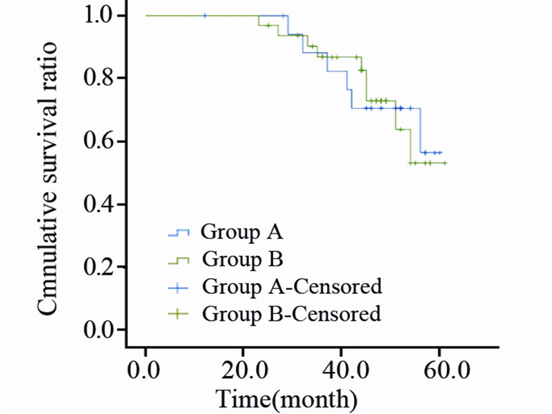 | Group A: Internal iliac artery chemotherapy group; Group B: Chemotherapy group 图 1 两组肌层浸润性膀胱癌保留膀胱患者累积生存分析 Figure 1 Cumulative survival analysis of two groups of muscle-invasive bladder cancer(MIBC) patients |
