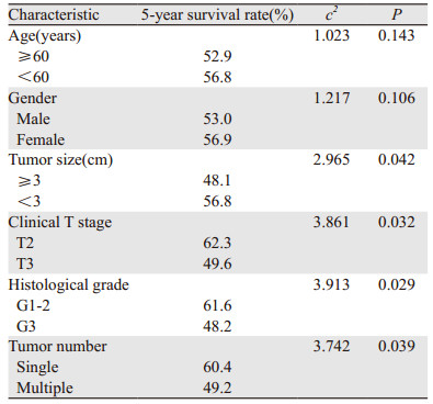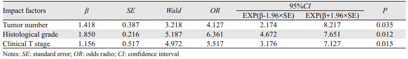 单因素分析显示:髂动脉化疗组患者预后影响因素为肿瘤大小、临床分期、病理分级以及肿瘤数目,见表 2;进一步行多因素分析结果显示影响髂动脉化疗组患者预后的因素为肿瘤数目、临床分期以及病理分级,见表 3。