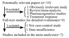 1.2 文献纳入标准纳入本次Meta分析的文献均符合以下标准:(1)原始资料为已公开发表的文献;(2)评估MTRR基因A66G多态性与儿童ALL发生关系的病例对照研究;(3)病例组按照儿童ALL通用诊断标准诊断明确;(4)病例组和对照组各基因型例数表达明确,当纳入研究未提供充足数据时,我们首先通过邮件向文章作者索要原始数据,如未收到相关数据则排除研究;(5)对照组各基因型分布符合Hardy-Weinberg平衡。病例报道、评论、综述和系统评价类文献不作为本研究纳入文献。