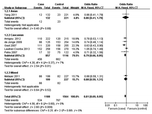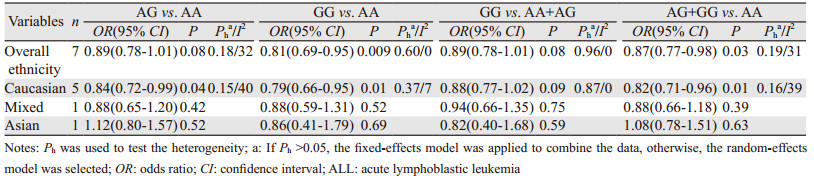 异质性检验结果和Meta分析结果见表 2。在整体人群四种遗传模型中均未发现纳入研究间存在显著异质性(AG vs.AA,χ2=8.84,Ph=0.18,I2=32%;GG vs.AA,χ2=4.56,Ph=0.60,I2=0%;GG vs.AA+AG,χ2=1.44,Ph=0.96,I2=0%;AG+GG vs.AA,χ2=8.73,Ph=0.19,I2=31%),因此采用固定效应模型合并效应值OR及其95% CI,见图 2、表 2。合并结果表明,在整体人群纯合子模型和显性模型发现MTRR基因A66G多态性与儿童ALL风险有显著性关联(GG vs.AA:OR=0.81,95% CI:0.69~0.95,P=0.009;AG+GG vs.AA:OR=0.87,95% CI:0.77~0.98,P=0.03),见图 2、表 2。根据种族进行亚组分析时在白种人群杂合子模型、纯合子模型和显性模型发现显著性关联(AG vs.AA:OR=0.84,95% CI:0.72~0.99,P=0.04;GG vs.AA:OR=0.79,95% CI:0.66~0.95,P=0.01;AG+GG vs.AA:OR=0.82,95% CI:0.71~0.96,P=0.01),在亚洲人群和混合人群四种遗传模型均未发现显著性关联,见图 2、表 2。