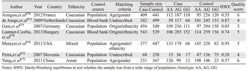 2 结果 2.1 纳入文献的基本情况根据文献检索策略共检出19篇可能相关的文献,初筛时排除10篇;仔细阅读文献全文后排除2篇,其中一篇非病例对照研究[15],另一篇未提供充足的原始数据[16]。因此,本研究最终共纳入7篇文献,包括儿童ALL患者2 326例,对照3 090例[17, 18, 19, 20, 21, 22, 23]。文献筛选的流程,见图 1。纳入文献质量评价结果显示:大多数纳入研究样本量充分、儿童ALL的诊断标准明确、分组匹配良好、组间可比性良好、基因检测方法合理、数据完整明确。因此,整体来看纳入研究的质量良好。在纳入的研究中,5项研究来自白种人群[19, 20, 21, 22, 23],一项来自亚洲人群[17],另一项为混合种人群[18]。纳入研究的对照组来自健康人群和血液捐献人群,主要以年龄、性别和种族与儿童ALL病例组匹配。纳入研究的对照组各基因型分布均符合Hardy-Weinberg平衡。各纳入研究的基本特征和原始数据见表 1。