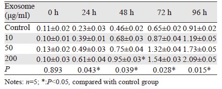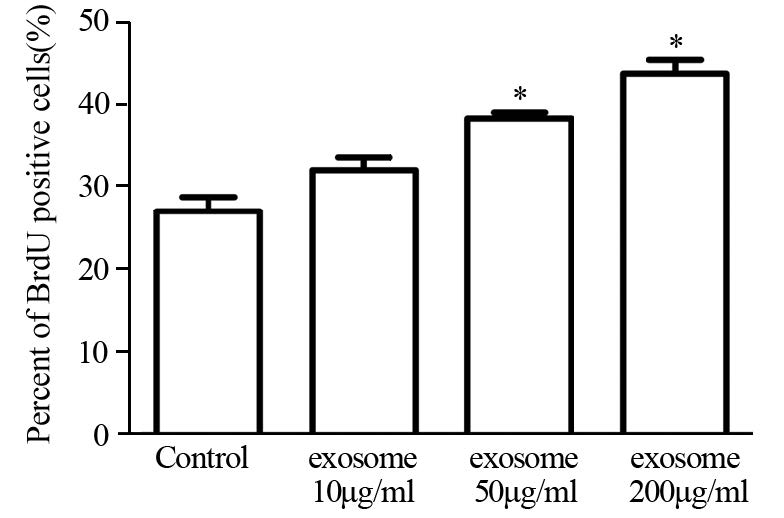 | *:P<0.05, compared with control group 图 1 exosome对4T1细胞DNA合成的影响 Figure 1 Effect of exosome on DNA systhesis of 4T1 cells |