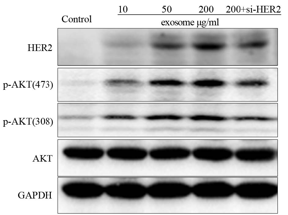 1.2.5 免疫印迹(Westernblot)实验 不同浓度的exosome作用96 h后,每组各收集1×106个细胞,裂解获取细胞总蛋白,各样品通过BCA法检测蛋白浓度,各蛋白样品按照上述检测所得浓度分别取50 μg行聚丙烯酰胺凝胶电泳,PVDF膜转膜并用脱脂奶粉封闭非特异性结合,依次孵育一抗及二抗最后用ECL显色液显影检测细胞中HER2、p-AKT(308)、p-AKT(473)和AKT的蛋白水平变化,以GAPDH作为内参,实验重复3次。