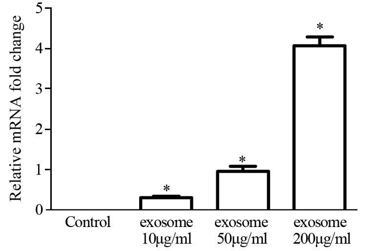 | n=3, *:P<0.05, compared with control group 图 4 qPCR检测不同浓度exosome对4T1细胞HER2 mRNA水平的影响 Figure 4 Effect of exosome on HER2 mRNA level in 4T1 cells observed by qPCR |