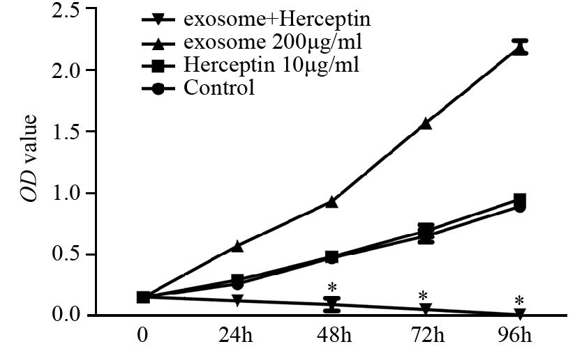 CCK8实验表明单独Herceptin对4T1细胞无明显杀伤作用,Herceptin作用后4T1细胞的增殖无显著变化,而同时给以200 μg/ml 的exosome处理细胞后,4T1细胞对Herceptin的敏感度明显增加,48 h开始出现统计学差异,差异最显著的96 h 时仅有约13% 4T1细胞存活,杀伤率达87%,见图 5。