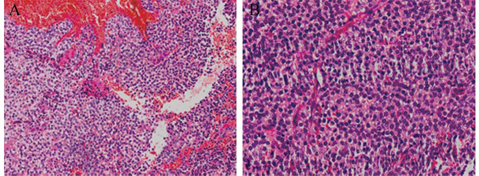 | The tumor cells of pPNET were composed of uniform small round cells A: HE ×200; B: ×400 图 1 外周型原始神经外胚叶瘤组织HE染色结果 Figure 1 HE results of pPNET tissues |