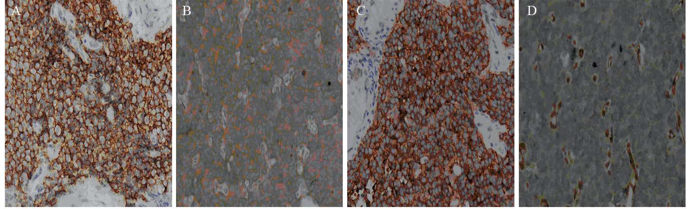 病理学特征:肉眼观可见实性肿块,与周围组织粘连,常伴有邻近骨质破坏,部分有包膜,部分伴有出血、坏死或黄白色黏稠液体。光学显微镜下肿瘤细胞多呈大小一致的小圆细胞,瘤细胞呈片状或巢状分布,胞体小、胞质少、有液泡,核深染、呈圆形或椭圆形,见图 1。免疫组织化学结果,见表 2、图 2。5例检测Ki67表达率分别为10%、30%、35%、45%及70%。