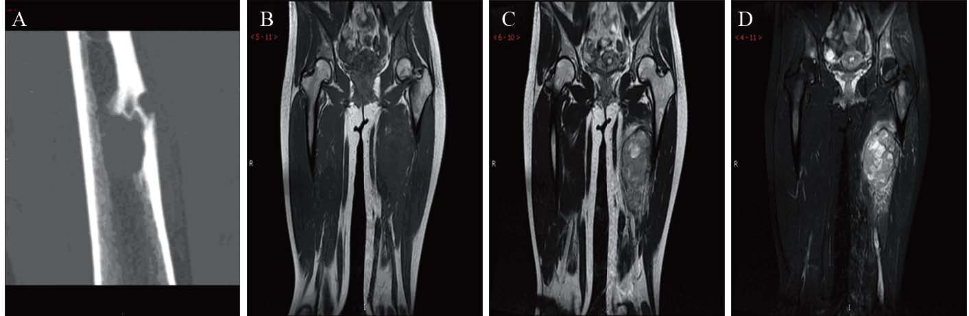 | A: CT 3D reconstrucion; B: T1WI; C: T2WI; D: T2WI-STIRA: CT scan showed a mass in the marrow cavity of right femur with bone destruction nearby; B-D: MRI showed the mass in the left leg had the similar T1 signal on the T1W1. T2W1 showed mainly long T2 signal. T2WI-STIR showed higher signal 图 3 外周型原始神经外胚叶瘤患者影像学检查结果 Figure 3 Imaging t results of pPNET patients |