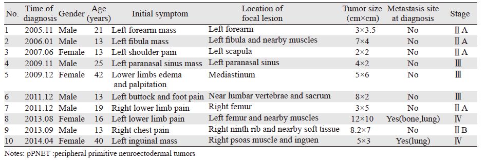 1 资料与方法 1.1 临床资料回顾性分析重庆医科大学附属第一医院2005年11月—2014年4月收治的10例经病理组织学、免疫组织化学确诊为pPNET患者的临床、病理、治疗及随访资料。纳入标准:(1)经手术或活检病理组织学、免疫组织化学确诊为PNET;(2)按照肿瘤生长部位,诊断为pPNET;(3)有完整的临床、病理、治疗及随访资料。排除标准:(1)结合临床资料,诊断为cPNET;(2)确诊后未在本院接受治疗的患者;(3)合并其他肿瘤性疾病者。按照美国癌症联合委员会(AJCC)第7版的肿瘤分期标准进行分期:ⅡA期4例,ⅡB期1例,Ⅲ期3例,Ⅳ期2例,见表 1。