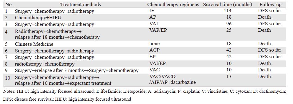 10例患者中5例行手术+术后放疗+化疗,其中1例治疗10月后出现原发部位肿瘤复发,另4例无瘤生存至今。2例行根治性放疗+化疗,其中1例治疗18月后出现肿瘤复发再行化疗。1例行单纯手术治疗,治疗3月后出现肿瘤复发行再次手术及化疗。1例行化疗+高强度聚焦超声(high intensity focused ultrasound,HIFU)治疗,1例行中药治疗。在7例行放疗的患者中,2例行根治性放疗、5例行术后放疗。7例均采用局部扩大野、常规分割放疗,根治性放疗剂量:62 Gy/31 f,术后放疗剂量:58 Gy/29 f~60 Gy/30 f。化疗方案多以长春新碱、环磷酰胺/异环磷酰胺、表柔比星、放线菌素D、依托泊苷、达卡巴嗪等为基础的2~4药联合化疗6~8周期,见表 3。