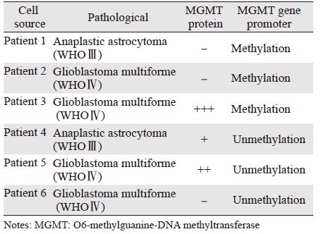 1 材料和方法 1.1 实验材料6例高级别胶质瘤细胞来源于人脑胶质瘤组织的培养,见表 1。GM-CSF购自美国Propretech公司,TMZ粉剂来源于默沙东公司,DMEM高糖培养液购自Hyclone公司,胎牛血清购自美国Gibco公司,胰蛋白酶和双抗(青霉素、链霉素)购自北京索莱宝科技有限公司,MGMT抗体购自美国Santa Cruz公司,甲基化特异性PCR试剂盒购自美国Abcam公司,MTT粉剂购自上海碧云天生物技术公司,流式凋亡试剂盒购自美国艾美捷Biovision公司,PI和 RnaseA购自武汉博士德生物公司。
