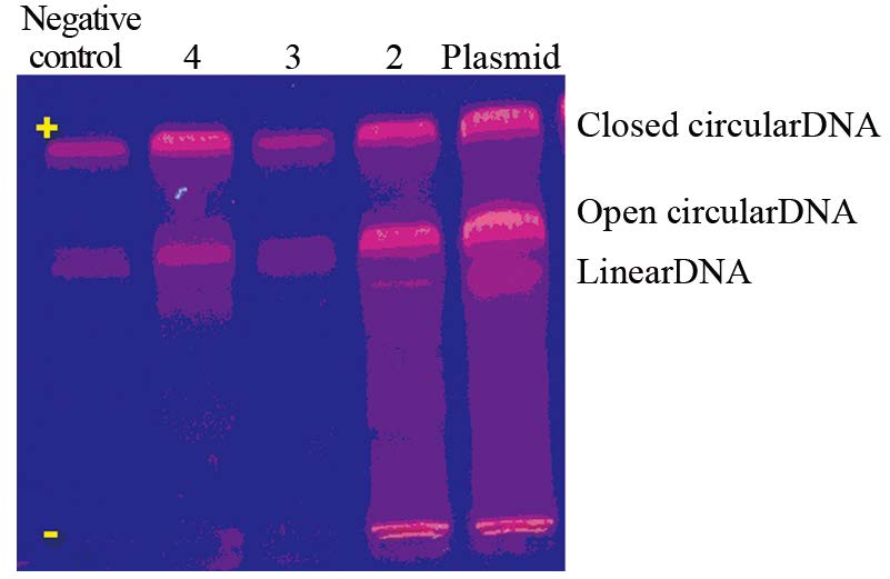 1.4 细胞转染由上海Invitrogen公司设计构建四个miR-TLR4质粒及一个阴性对照质粒,并转化入大肠杆菌,见表 1、图 1。向5个烧瓶中各加入100 ml LB培养液,然后分别加入1、2、3、4号及阴性对照菌液各1 ml,置于水平摇床内37℃恒温、250 r/min恒速摇菌过夜(约12~16 h)。获得大量菌体后运用质粒大提试剂盒(美国TIANGEN公司)纠集纯化质粒。经1.0%琼脂糖胶电泳2 h,验证纯化质粒,从正极往负极分别是闭环形、开环形和线性质粒,以有功能的闭环为主,说明质粒较纯,见图 2。Lipofectamine2000法转染各组细胞,每组加入质粒各8 μg,24~48 h后荧光显微镜下观察转染效率。收集细胞进行生物学指标检测。