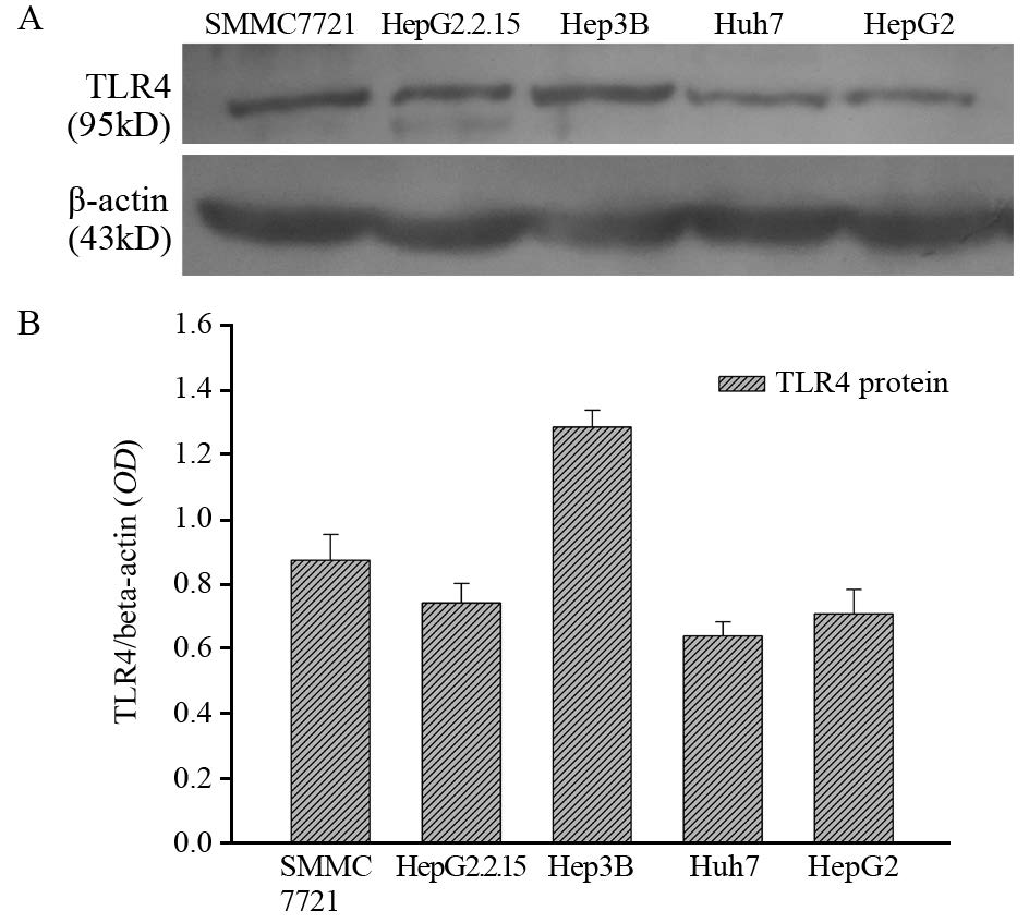 2 结果 2.1 肝癌细胞株中TLR4蛋白的表达TLR4蛋白在五种肝癌细胞株(SMM7721、Huh7、Hep3B、HepG2.2.15和HepG2)中均有表达,在Hep3B细胞中表达最高,其次是SMMC7721、HepG2.2.15和HepG2细胞,而在Huh7细胞中表达最低,见图 3。