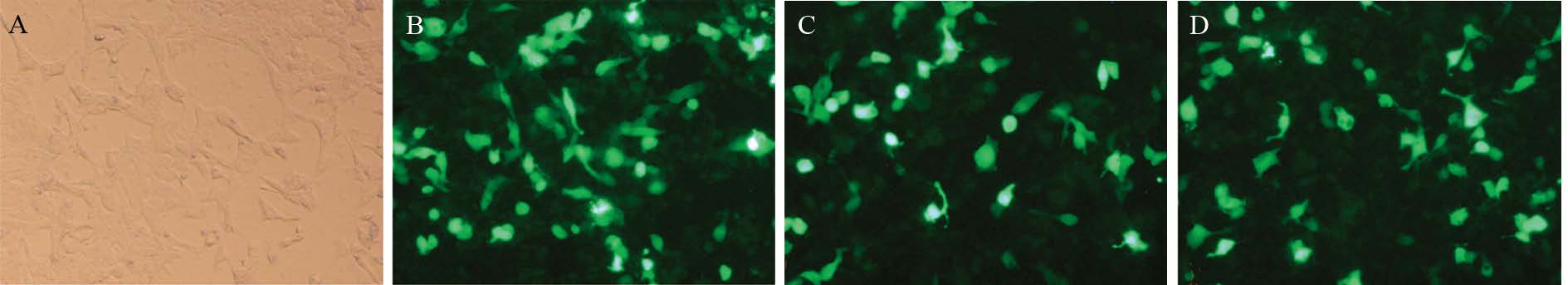 | A: normal group; B: negative control group; C: miR-TLR4-3 group; D: miR-TLR4-4 group 图 4 荧光显微镜下观察转染miR-TLR4质粒24h后各组绿色荧光蛋白的表达情况 (×200) Fig. 4 Green fluorescent protein expression of Hep3B cells transfected with miR-TLR4 plasmid after 24h detected by fluorescent microscope (×200) |