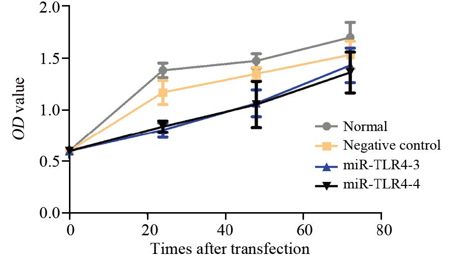 | miR-TLR4-3 vs. normal and negative control groups at 24h: P=0.011,0.026; miR-TLR4-4 vs. normal and negative control groups: P=0.025,0.028 图 6 不同转染组细胞的生长曲线 Fig. 6 Cell growth curves of different transfected groups |