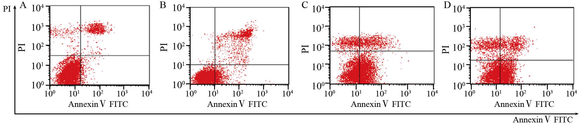 | A: normal group; B: negative control group; C: miR-TLR4-3 group; D: miR-TLR4-4 group 图 8 不同TLR4干扰组细胞凋亡结果 Fig. 8 Cell apoptosis in different miR-TLR4 groups |