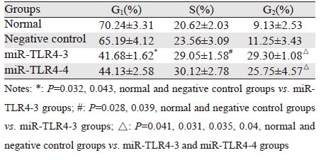 与正常组及阴性对照组相比,转染干扰片段3、4后Hep3B细胞凋亡率明显上升。虽然阴性对照组相比正常对照组凋亡稍增加,干扰组3和4对正常组以及阴性对照组差异均较明显,这就可排除质粒引起凋亡为主要原因这一误差(P<0.05),见表 2、图 8。另外,细胞周期检测结果显示,干扰TLR4表达后S、G2期细胞比列明显增加(P<0.05),G1期细胞比例减少,周期阻滞于G2/M期(P<0.05),见表 3、图 9。