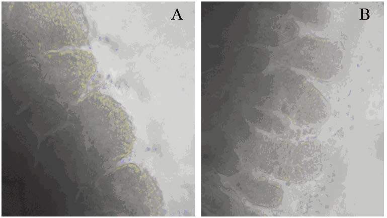 | Compared with basic media(A), cells number around the tissue were more intensive in the basic media with 10ng/ml TGF-β1(B) after 72h; in the media with 2.5μmol/L 5-Aza-dC after TGF-β interference(C), cells number around the tissue were declined The intestinal crypt and villus of colon were clear and could be observed in the early stage of culture (A); during the tissue culture, cells migrated from the edge of the tissues and grew like paving stone on the bottom of petri dish, the morphology of the tissue was changed and the intestinal crypt and villus gradually disintegrated, the cells grew around the tissues (B) 图 2 倒置显微镜下可见乳鼠大肠组织块边缘及迁移出的细胞数变化 (×250) Fig. 2 Change of neonatal rat’s tissue edge and migrated cells number during culture under inverted microscope (×250) |