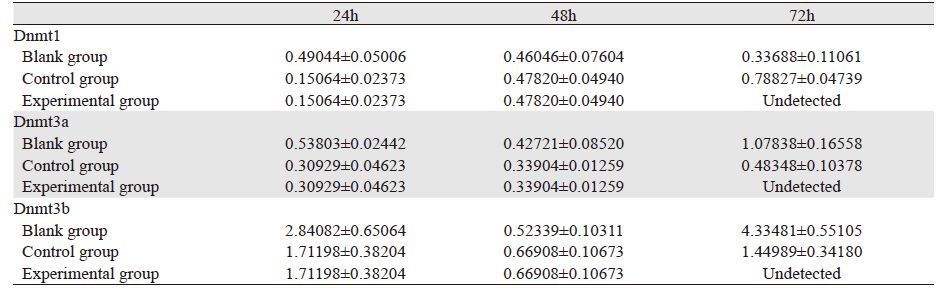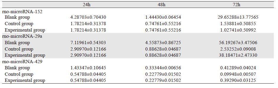 通过大量文献和Targetscan、Pictar等数据库,查找了调控Dnmt1、Dnmt3a和Dnmt3b三个关键酶的主要miRNA作为检测标志物,分别为rno-microRNA-152、rno-microRNA-29a、rno-microRNA-429。对照组三个miRNA的表达量较空白组均明显下调,72 h的表达量对照组vs.空白组,两组对比差异有统计学意义(miRNA-29a P=0.001; miRNA-429 P=0.006),而rno-microRNA-152在72 h的表达量(1.53881±0.50855)较空白组(29.65288±13.77565),差异无统计学意义(P=0.072)。经过5-Aza-dC干预后,实验组rno-microRNA-29a和rno-microRNA-429的表达量升高,实验组vs.对照组(miRNA-29a P=0.002; miRNA-429 P=0.0001),而rno-microRNA-152表达水平在5-Aza-dC干预后数值虽有所上升,但是与对照组相比表达量较低且差异没有统计学意义[(1.02741±0.50992)vs.(1.53881±0.50855),P=0.286]。rno-microRNA-29a在实验72 h空白组中的相对表达量为(56.19267±3.47506),较对照组的相对表达量(2.53252±0.09008)差异无统计学意义(P=0.001),实验组经过5-Aza-dC干预后的相对表达量上调至(38.18471±2.47330)。对于rno-microRNA-429来说也有相似的表达改变,实验组中经5-Aza-dC干预后,其表达量为(0.39290±0.03125),接近空白组(0.41289±0.04024)且远高于对照组(0.09948±0.00507),(空白组vs.实验组,P=0.5339),见表 2。