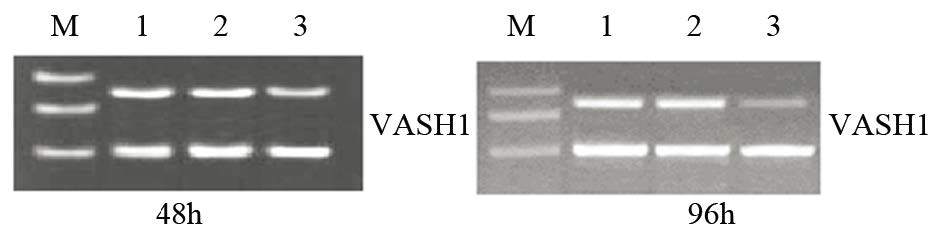 | 1: control group; 2: negative group; 3: pGCL-GFP-VASH1 group 图 1 RT-PCR检测VASH1 shRNA转染U-87MG细胞后VASH1 mRNA的表达 Figure 1 Expression of VASH1 mRNA in U-87MG cells transfected with VASH1 shRNA detected by RT-PCR |