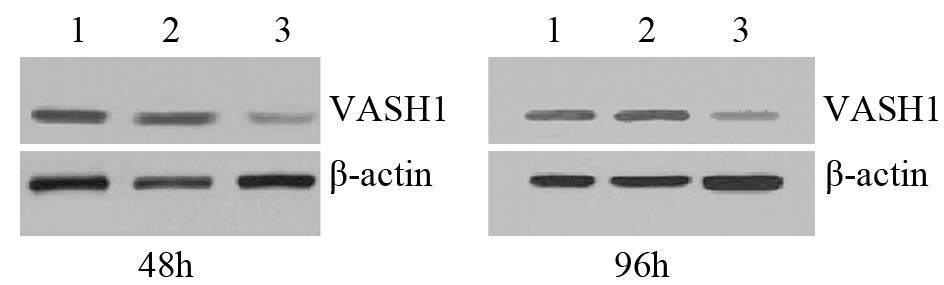 结果显示转染48、96 h时pGCL-GFP-VASH1组VASH1蛋白的表达均明显受到抑制,与阴性对照组及空白对照组比较,差异均有统计学意义(P=0.000);阴性对照组和空白对照组VASH1蛋白的表达差异无统计学意义(P=0.527),见图 2。