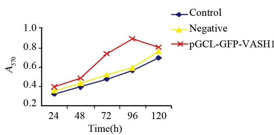blot检测U-87MG细胞中VASH1蛋白的表达量 收集细胞,细胞裂解液处理细胞,离心后取上清液,考马斯亮蓝法测定蛋白质浓度,聚丙烯酞胺凝胶电泳,将蛋白电转至硝酸纤维膜上,与VASH1抗体结合,之后用辣根过氧化物酶结合的二抗结合,ECL法显色后照相。最后以Image-Pro Plus 4.5图像分析系统测定各条带灰度值,以此反映VASH1蛋白的表达度。 1.2.6 MTT法检测转染VASH1