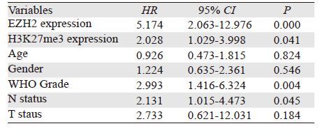 2.6 EZH2和H3K27me3蛋白表达与ESCC患者预后的关系EZH2和H3K27me3表达阳性的ESCC患者五年总生存率明显低于表达阴性的患者(P=0.001和P=0.002);EZH2和H3K27me3双阳性的ESCC患者五年总生存率明显低于EZH2和H3K27me3单阳性和双阴性的患者(P=0.000),见图 3。提示EZH2和H3K27me3蛋白的高表达与ESCC患者的不良预后相关。多因素Cox回归分析结果显示,淋巴结转移、组织学分级、EZH2表达和H3K27me3表达是ESCC患者的独立预后因素,见表 4。
