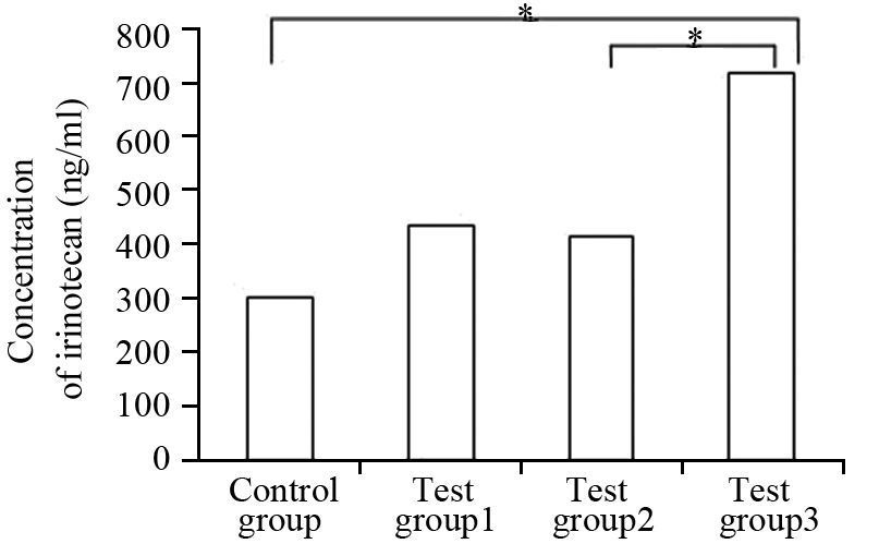 伊立替康给药30 min后在对照组、实验1组、实验2组、实验3组的外周血伊立替康浓度分别为(299.69±83.63)、(432.33±104.76)、(409.69±267.15)、(719.21±253.00)ng/ml。实验1组、实验2组、实验3组的浓度均明显高于对照组,其中实验3组与对照组的差异有统计学意义(P=0.010)。实验1组、实验2组、实验3组三组间的比较,实验3组明显高于实验1组和实验2组,其中实验3组与实验2组间的差异有统计学意义(P=0.045),见图 2。