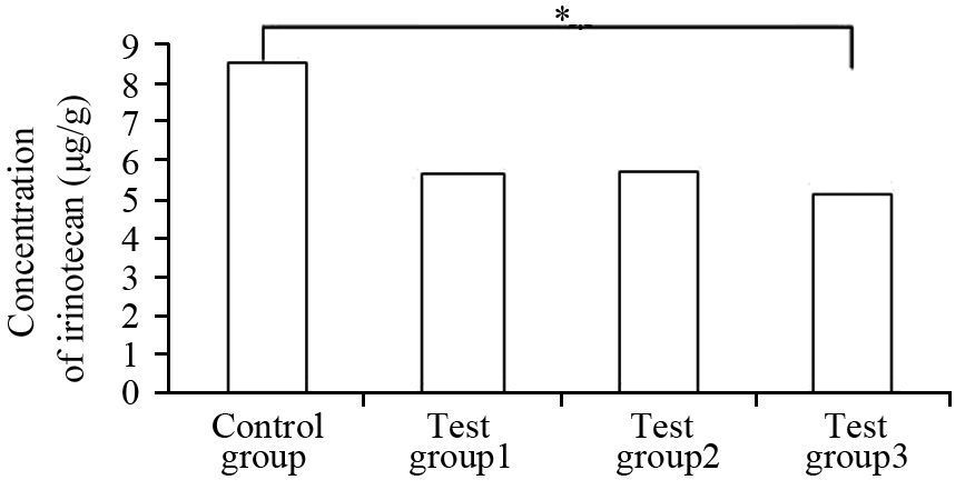 肿瘤组织内伊立替康的浓度在对照组、实验1组、实验2组、实验3组分别为(8.47±2.60)、(5.62±3.12)、(5.73±1.79)和(5.11±3.26)μg/g。实验1组、实验2组、实验3组的浓度均明显低于对照组,其中实验3组与对照组的差异有统计学意义(P=0.047)。实验1组、实验2组、实验3组三组间的比较,差异无统计学意义(P=0.941),见图 3。