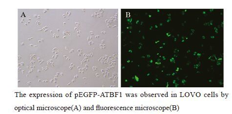 1.2.3 实时定量荧光PCR检测各组细胞ATBF1的转染情况将pEGFP-ATBF1转染LOVO细胞,并设空白组和对照组,用TRIzol提取总RNA,测定样本A260/A280及样本浓度。通过北京天根生化科技有限公司的 FastQuant RT Kit(with gDNase)试剂盒进行反转录合成cDNA。由上海生工生物工程有限公司设计并合成ATBF1、内参ACTB引物:ATBF1上游引物: 5’-CAAGTTCACGACGGACAACCT-3’;下游引物:5’-GCTTGCACTGGTATGAGTCCC-3’。ACTB上游引物:5’-GAA ATC GTG CGT GAC ATT AAG-3’; 下游引物: 5’-CTA GAA GCA TTT GCG GTG GAC GAT GGA GGG GCC-3’。按照天根公司SuperReal PreMix Plus试剂盒说明书,通过Bio-Rad公司PCR仪器(7500)SYBR ® Green分析法进行荧光定量PCR检测。反应条件:(1) 95℃ 15 min;(2) 95℃ 10 s,60℃ 60 s,40个循环;(3) 95℃ 15 s,55℃ 45 s,95℃ 15 s。最后以2-ΔΔCT法计算基因相对表达量。
