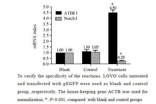 运用2-△△CT计算出各组细胞的ATBF1 mRNA水平与空白组的相对表达量,结果显示,实验组的ATBF1 mRNA量明显高于空白组与对照组(P<0.001),而空白组与对照组的ATBF1 mRNA差异无统计学意义。与此相反实验组的Notch3 mRNA低于空白组与对照组(P<0.001)。