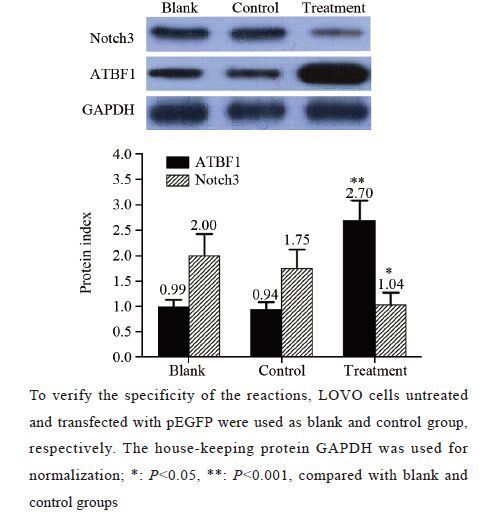 | 图 3 ATBF1、Notch3的Western blot分析结果 Fig. 3 Western blot analysis of ATBF1 and Notch3protein |
