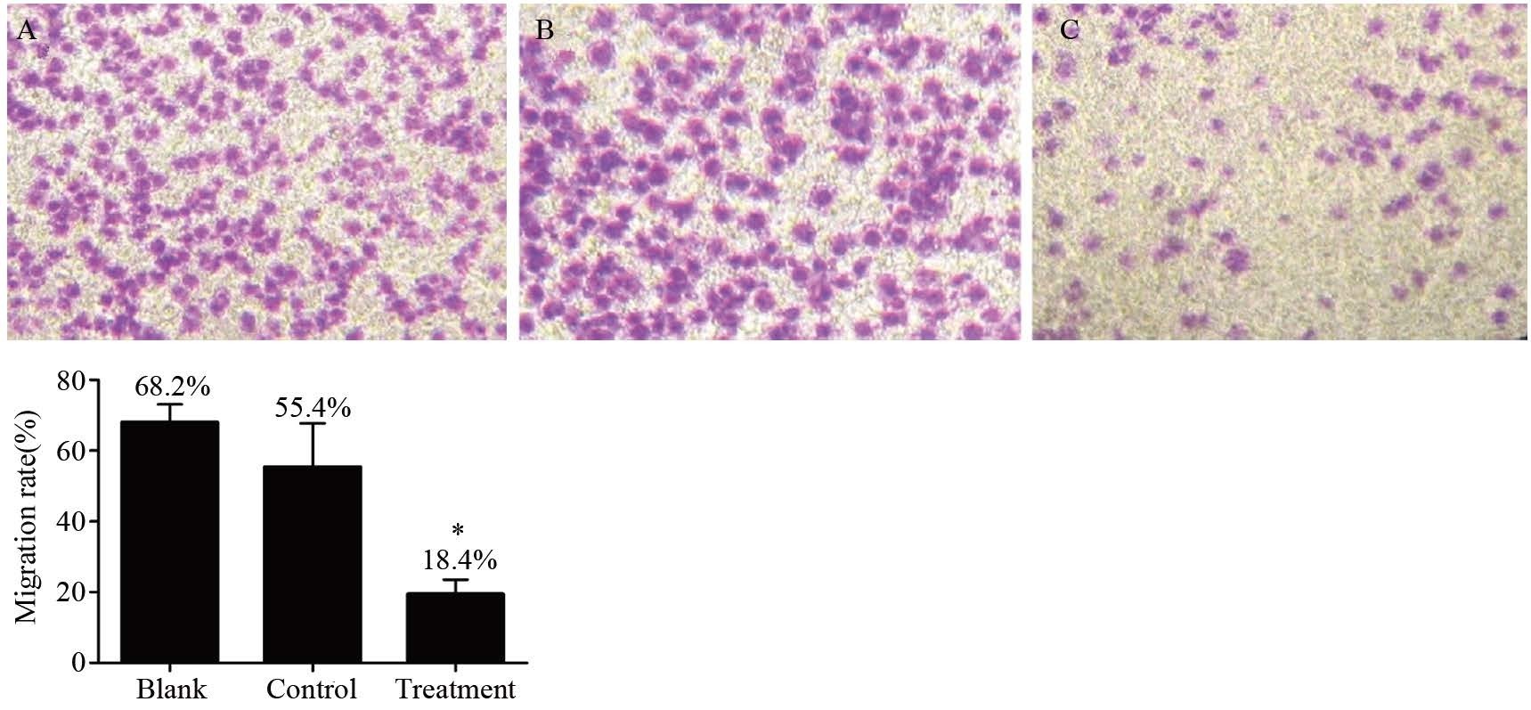 小室上室的LOVO细胞穿过膜上Matrigel胶到膜的下室面,其迁移率的高低反映了肿瘤细胞侵袭能力的大小。收集转染48 h的细胞,采用Boyden小室检测三组细胞的侵袭情况。结果发现,与对照组、空白组比较,实验组的迁移率明显下降(P<0.001),见图 6。