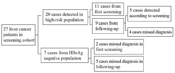 | 图 1 初筛及随访漏诊肝癌患者情况 Fig. 1 Diagosis and missed diagnosis liver cancer patients in first screening and follow-up |