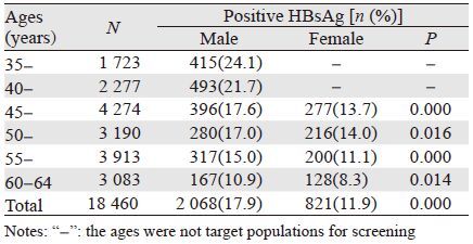 3 讨论乙型肝炎病毒感染与肝癌的发生有密切关系。本研究对肝癌高发区广东省中山市小榄镇35~64岁男性居民和45~64岁女性居民进行血清HBsAg检测,结果显示筛查人群HBsAg阳性率高于厦门市自然人群和深圳市常住居民HBsAg阳性率[4, 5],推测与检测人群年龄选择性有关。其中男女性HBsAg阳性率分别为17.9%和11.9%,男性阳性率显著高于女性。这可能是男性肝癌发病风险高于女性的重要原因之一。而男女人群HBsAg阳性率均随着年龄的增长呈降低趋势,与张春燕等[6]研究结果相一致。